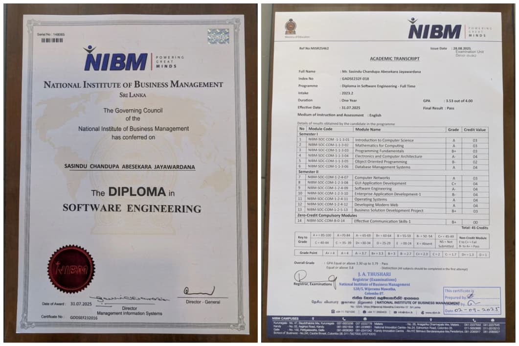 I’m proud to share that I have successfully completed my Diploma in Software Engineering at the NIBM-Galle University. With a GPA of 3.53/4.0 and all module results completed in the first attempt.